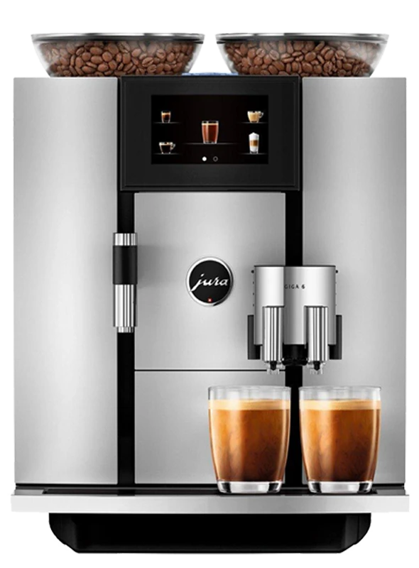 JURA is redefining the concept of automatic coffee machines with the GIGA 6. This professional machine for household use is brimming with the latest technology for outstanding results. Made of top-quality materials and with Swiss precision, the GIGA 6’s clear design features radiate power and expertise. The impressive quality of the iconic new automatic coffee machine is emphasized by the solid front section made of 3 mm-thick aluminum and the substantial aroma preservation cover made of chrome-plated, die-cast zinc. Operating this masterpiece of Swiss engineering is completely intuitive thanks to the touchscreen color display and the Blue Crystal Rotary Switch, and the icing on the cake is that coffee lovers can choose from 28 different specialties. 5-star handling on a whole new level is made possible by artificial intelligence and the ingenious design, which has been carefully considered right down to the last detail.