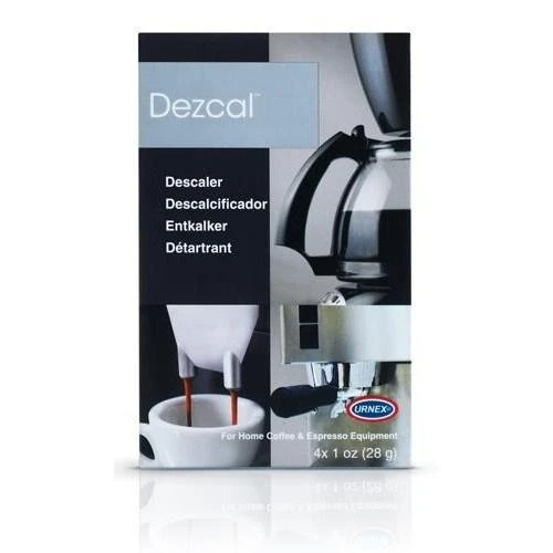 Dezcal™ is a citric acid based, non-toxic, biodegradable and safe descaler that breaks down lime scale and calcium deposits. Dezcal™ is safe and easy to use – it’s as simple as brewing a cup of coffee. Each box contains 4 packets of descaler.